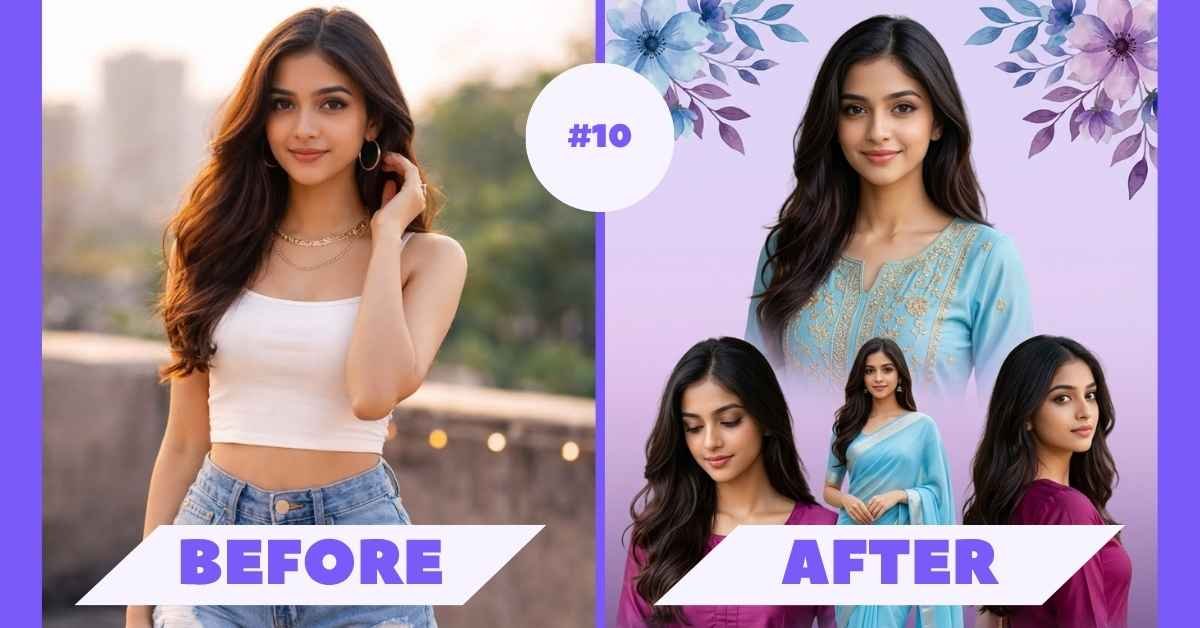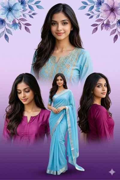 In this article, you will get a ready-to-use Gemini AI image prompt and ChatGPT image prompt that helps you create a stunning collage with multiple poses, soft gradient background, floral designs, and traditional Indian outfits — all while keeping your face exactly the same.