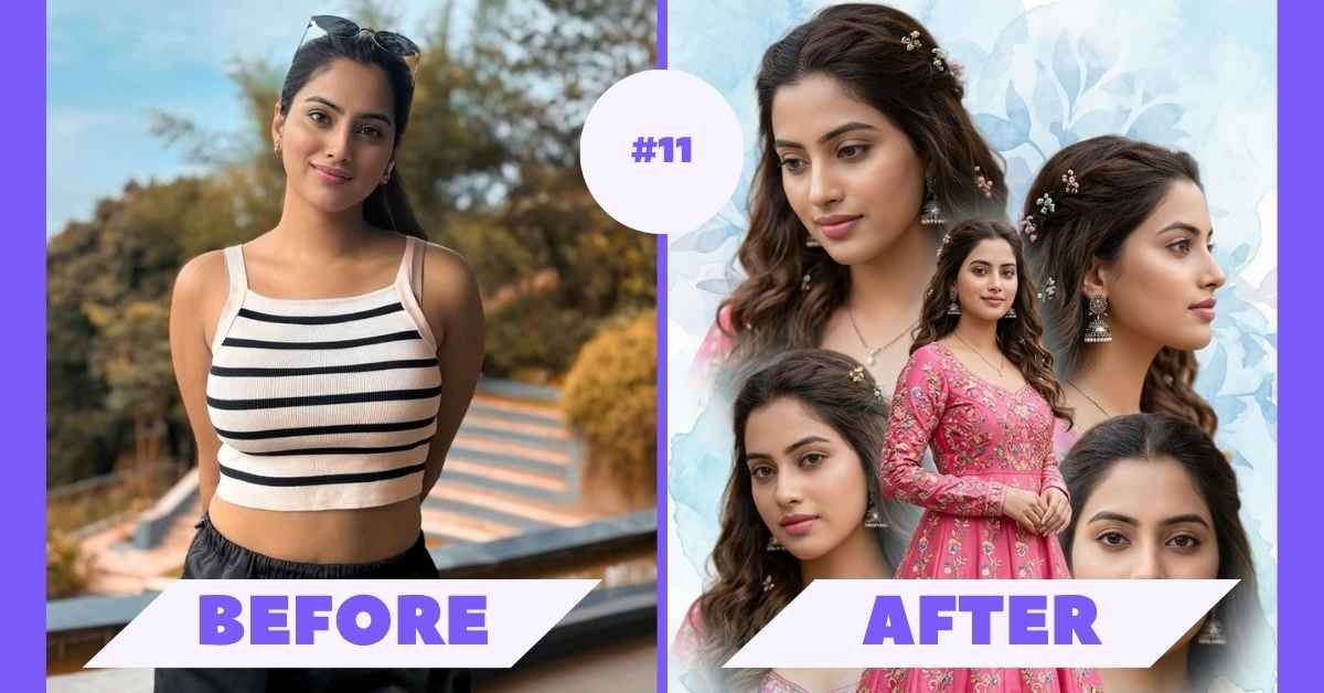 Today, AI tools like Gemini and ChatGPT are helping users turn simple photos into professional-level traditional photoshoots. You don’t need expensive cameras, studios, or designers anymore. With just one prompt, you can create a beautiful collage with multiple poses, designer outfits, and artistic backgrounds.