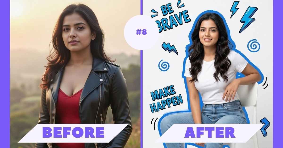 With this prompt, you can create a clean studio portrait with pop-art design elements like outlines, lightning effects, and stylish text. The best part is your face remains 100% original, no AI changes, no fake look.