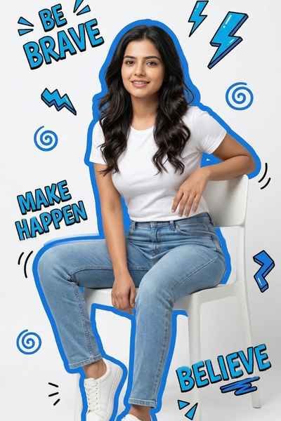 Use the uploaded image as the only face reference and create a high-quality studio portrait of the same person sitting confidently on a white chair, wearing a white t-shirt, light blue jeans, and white sneakers. The subject should have long wavy hair and a relaxed, confident posture, with a natural expression. Strictly maintain 100% face identity — the facial features, structure, skin tone, eyes, nose, lips, and proportions must remain exactly the same as in the reference image. Do not modify, beautify, retouch, smooth, or stylize the face in any way. No face swap, no enhancement, no symmetry correction. The background should be a clean solid white studio setup with soft, even lighting and realistic shadows. Add 2D graphic pop-art overlays including a bold blue silhouette outline around the subject, along with dynamic elements like lightning bolts, spirals, and playful shapes. Include stylized text elements “BE BRAVE”, “MAKE HAPPEN”, and “BELIEVE” integrated naturally into the composition. The final output should blend realistic photography with graphic pop-art design while keeping the face completely unchanged, with sharp details, natural skin texture, and a professional studio look.