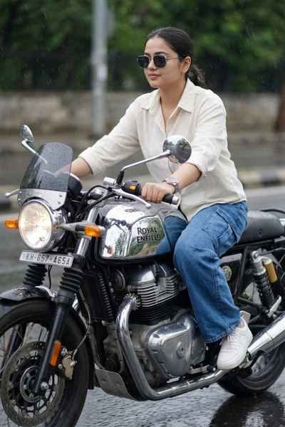 Use the uploaded image as the only face reference and create a photo-realistic shot as if captured on an iPhone 15 Pro Max camera, featuring the same person riding a chrome Royal Enfield Continental GT-650 motorcycle on a dark rainy day. Strictly maintain 100% face identity — the facial features, structure, skin tone, eyes, nose, lips, hairstyle, and proportions must remain exactly the same as in the reference image. Do not modify, beautify, retouch, smooth, sharpen, or stylize the face in any way, and avoid any face swap or AI enhancement. The subject should be slightly leaned forward while riding, looking toward the road with a calm and relaxed expression. The outfit should include a boxy fit off-white button-down shirt, loose blue baggy-fit jeans, clean white sneakers, a metal wristwatch, and square frame dark lens sunglasses, with no additional accessories. Ensure the motorcycle branding “Royal Enfield” is clearly visible on the tank with realistic metallic reflections and detailed engine textures. Capture the scene from a slight side angle with a natural smartphone perspective, maintaining sharp but realistic focus, slight natural grain, balanced exposure, and true-to-life colors. The skin texture should remain natural with visible pores, no smoothing or filters, and no cinematic color grading, ensuring an authentic iPhone camera look while keeping the face completely unchanged from the original image.